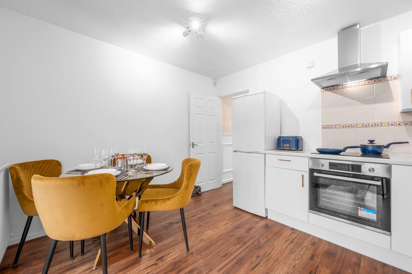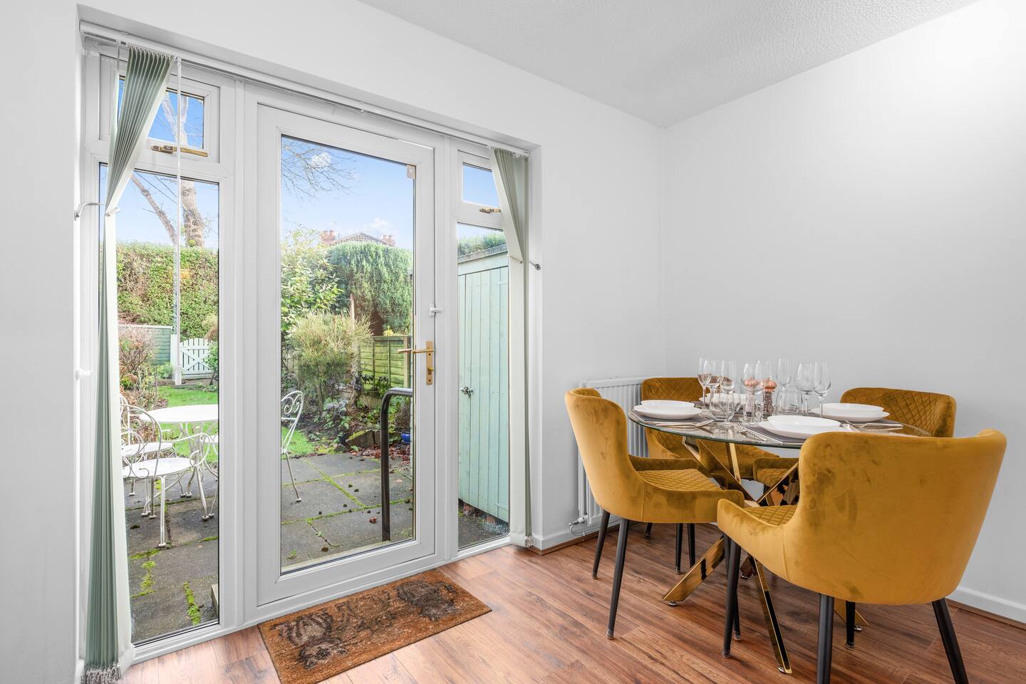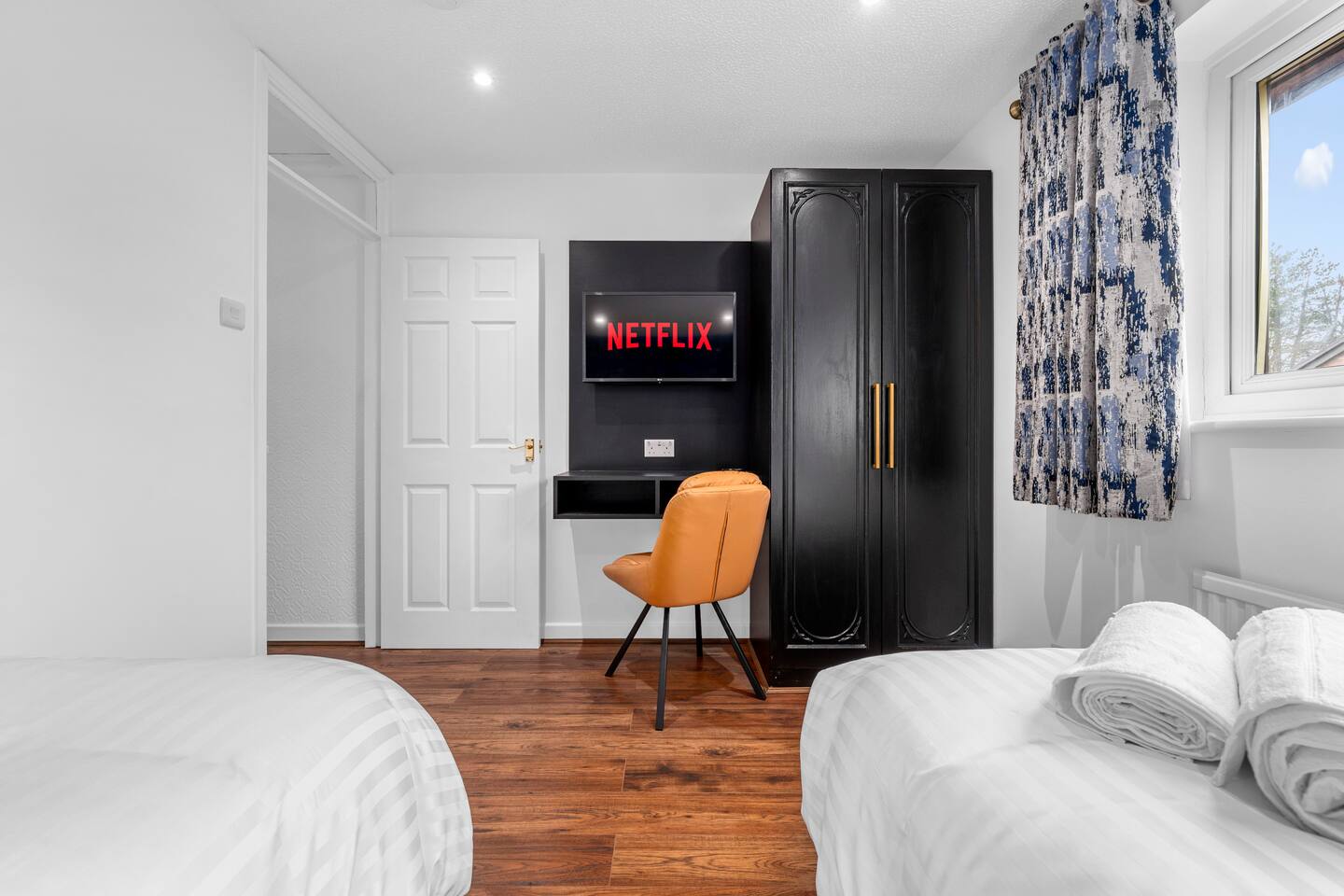 Bedrooms: Master bedroom with a plush double bed, high-end bedding, media wall with Smart TV, electronic safe, and a workspace with desk, chair, and USB charging points. Second bedroom featuring two cozy single beds, a media wall with Smart TV, electronic safe, and a dedicated workspace. Living Room: Spacious and elegantly designed with a feature wall-mounted Smart TV, loaded with all popular streaming apps, and a stylish electric fireplace. Comfortable seating, vibrant feature lighting, and tasteful decor create a welcoming ambiance. Kitchen & Dining: Fully equipped modern kitchen with a fridge, freezer, microwave, dishwasher, washing machine, and Dolce Gusto coffee maker. Complimentary tea bags, instant coffee, cappuccino pods, and sugar provided. Dining area with chic seating for four. Bathroom: Contemporary design with a standing shower and high-quality fittings. Complimentary towels, liquid hand wash, shampoo, conditioner, and body wash provided. Outdoor Space: Fenced back garden with a beautiful sitting area and seasonal flowers; perfect for your morning coffee or evening relaxation. Parking & Charging: Dedicated free bay parking for standard cars and SUVs, with free street parking for larger vehicles. Electric car charging available upon request (extra charge applies). Additional Features: High-speed WiFi, suitable for remote work. Dedicated work space in each bedroom with access to electric outlet and USB charging. Safety: Safety measures include interlinked smoke alarms, carbon monoxide detectors, exterior security cameras (front and rear), and a noise detection device to ensure safety and comfort. Digital safes in each bedroom. Check-in: Self-check-in for ultimate flexibility. Nearby Attractions: Sale Town Centre (5-minute drive): Restaurants, cafes, and bars. Altrincham Town Centre (10-minute drive): A vibrant hub of shops and eateries. Trafford Centre (15-minute drive): High-street and luxury shopping, family-friendly entertainment. Manchester City Centre (30-minute drive or 40-minute tram): Iconic attractions, shopping, and nightlife. Brooklands Tram Station (16-minute walk): Easy access to public transport. Guest Information: No smoking or pets allowed. Quiet hours from 11 PM to 7 AM. Check-in at 4 PM; check-out at 10 AM (early check-in and late check-out available for an extra fee, subject to availability). Whether you're visiting for business, a family getaway, or a long-term stay, this property offers everything you need for a memorable experience. Book now to enjoy luxury and convenience in the heart of South Manchester!